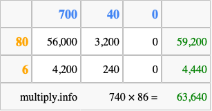 Finally, we add up all the sums we found in step 3 to get our final answer to 740 times 86.