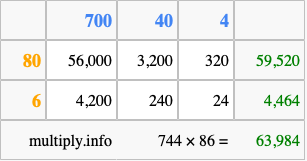 That's all there is to it! As you can see from the box above, the answer to 744 times 86 using the box method is 63,984.