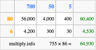 Finally, we add up all the sums we found in step 3 to get our final answer to 755 times 86.