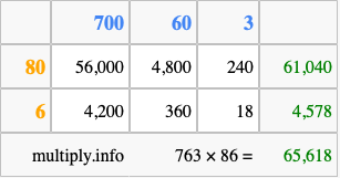 Finally, we add up all the sums we found in step 3 to get our final answer to 763 times 86.