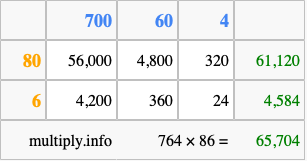 Finally, we add up all the sums we found in step 3 to get our final answer to 764 times 86.