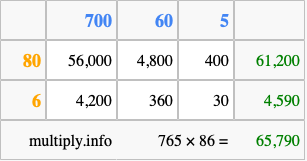 Finally, we add up all the sums we found in step 3 to get our final answer to 765 times 86.