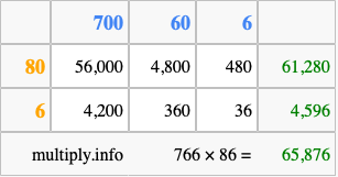 Finally, we add up all the sums we found in step 3 to get our final answer to 766 times 86.