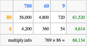 Finally, we add up all the sums we found in step 3 to get our final answer to 769 times 86.