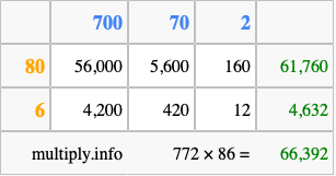 That's all there is to it! As you can see from the box above, the answer to 772 times 86 using the box method is 66,392.