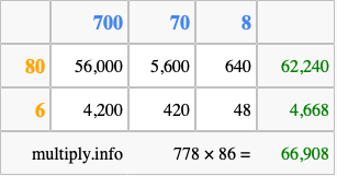 Finally, we add up all the sums we found in step 3 to get our final answer to 778 times 86.