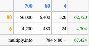 Finally, we add up all the sums we found in step 3 to get our final answer to 784 times 86.
