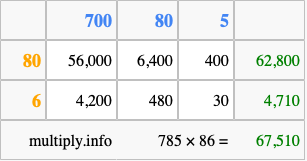 Finally, we add up all the sums we found in step 3 to get our final answer to 785 times 86.