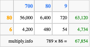 Finally, we add up all the sums we found in step 3 to get our final answer to 789 times 86.