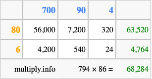 Finally, we add up all the sums we found in step 3 to get our final answer to 794 times 86.