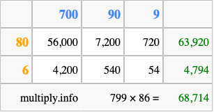 Below is an illustration showing you how to calculate 799 times 86 using the box method, using the instructions above.