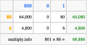 Finally, we add up all the sums we found in step 3 to get our final answer to 801 times 86.