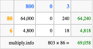 That's all there is to it! As you can see from the box above, the answer to 803 times 86 using the box method is 69,058.