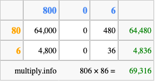 Finally, we add up all the sums we found in step 3 to get our final answer to 806 times 86.