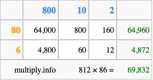 That's all there is to it! As you can see from the box above, the answer to 812 times 86 using the box method is 69,832.