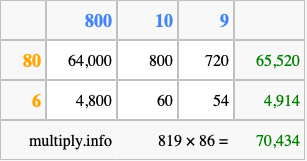 That's all there is to it! As you can see from the box above, the answer to 819 times 86 using the box method is 70,434.