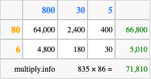 Finally, we add up all the sums we found in step 3 to get our final answer to 835 times 86.