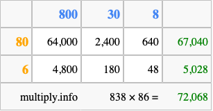 Finally, we add up all the sums we found in step 3 to get our final answer to 838 times 86.