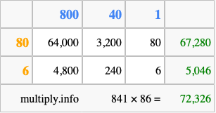That's all there is to it! As you can see from the box above, the answer to 841 times 86 using the box method is 72,326.
