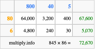 Finally, we add up all the sums we found in step 3 to get our final answer to 845 times 86.