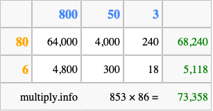 Finally, we add up all the sums we found in step 3 to get our final answer to 853 times 86.