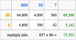 That's all there is to it! As you can see from the box above, the answer to 857 times 86 using the box method is 73,702.
