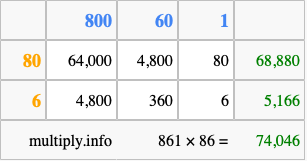 That's all there is to it! As you can see from the box above, the answer to 861 times 86 using the box method is 74,046.