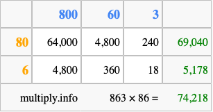 That's all there is to it! As you can see from the box above, the answer to 863 times 86 using the box method is 74,218.