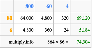 Finally, we add up all the sums we found in step 3 to get our final answer to 864 times 86.