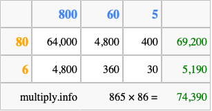 That's all there is to it! As you can see from the box above, the answer to 865 times 86 using the box method is 74,390.