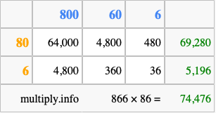 That's all there is to it! As you can see from the box above, the answer to 866 times 86 using the box method is 74,476.