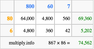 That's all there is to it! As you can see from the box above, the answer to 867 times 86 using the box method is 74,562.