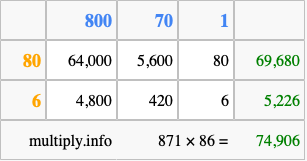 Finally, we add up all the sums we found in step 3 to get our final answer to 871 times 86.