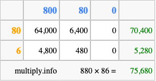 Below is an illustration showing you how to calculate 880 times 86 using the box method, using the instructions above.