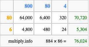 Finally, we add up all the sums we found in step 3 to get our final answer to 884 times 86.