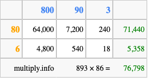 That's all there is to it! As you can see from the box above, the answer to 893 times 86 using the box method is 76,798.