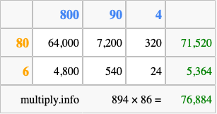 Finally, we add up all the sums we found in step 3 to get our final answer to 894 times 86.