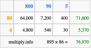 Finally, we add up all the sums we found in step 3 to get our final answer to 895 times 86.