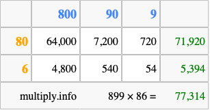 Finally, we add up all the sums we found in step 3 to get our final answer to 899 times 86.
