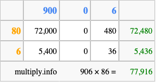 Finally, we add up all the sums we found in step 3 to get our final answer to 906 times 86.