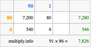 Below is an illustration showing you how to calculate 91 times 86 using the box method, using the instructions above.