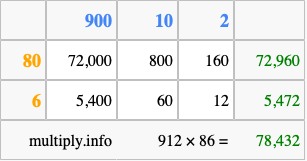 Finally, we add up all the sums we found in step 3 to get our final answer to 912 times 86.