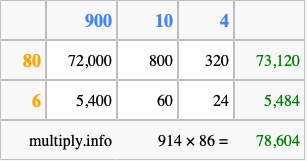Finally, we add up all the sums we found in step 3 to get our final answer to 914 times 86.