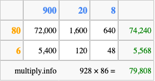 Below is an illustration showing you how to calculate 928 times 86 using the box method, using the instructions above.
