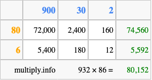 Finally, we add up all the sums we found in step 3 to get our final answer to 932 times 86.