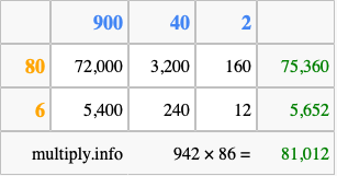 Finally, we add up all the sums we found in step 3 to get our final answer to 942 times 86.