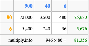 That's all there is to it! As you can see from the box above, the answer to 946 times 86 using the box method is 81,356.