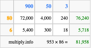 Finally, we add up all the sums we found in step 3 to get our final answer to 953 times 86.