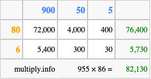 Finally, we add up all the sums we found in step 3 to get our final answer to 955 times 86.