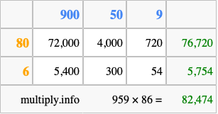 Finally, we add up all the sums we found in step 3 to get our final answer to 959 times 86.